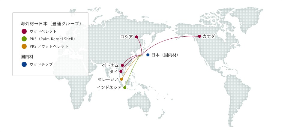豊通エネルギーはバイオマス燃料(PKS/ウッドペレット/国内材)供給を通じて、持続可能な社会の実現を目指します。